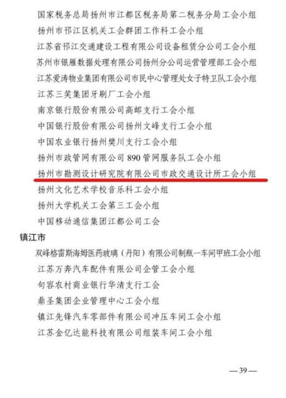 近日,江蘇省總工會(huì)印發(fā)《關(guān)于表彰江蘇省模范職工之家、模范職工小家、優(yōu)秀工會(huì)工作者的決定》,揚(yáng)州市勘測(cè)設(shè)計(jì)研究院有限公司市政交通設(shè)計(jì)所工會(huì)小組被江蘇省總工會(huì)授予“江蘇省模范職工之家”稱號(hào)。